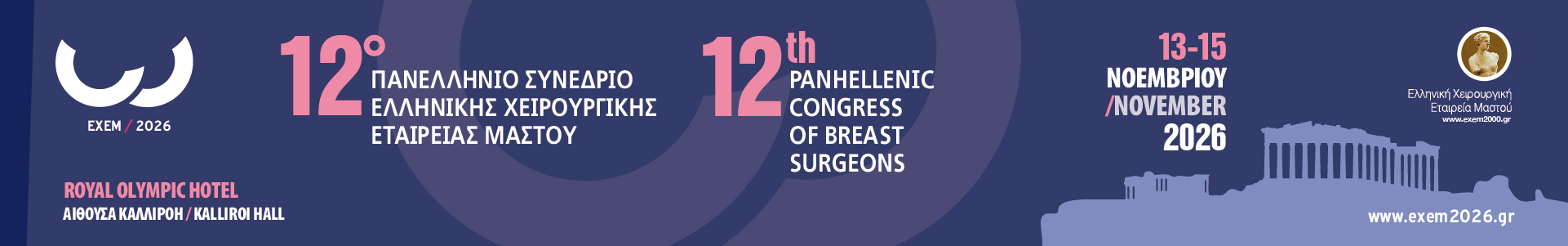 Με ιδιαίτερη χαρά και τιμή σας προσκαλούμε στο 12ο Πανελλήνιο Συνέδριο της Ελληνικής Χειρουργικής Εταιρείας Μαστού, μια σημαντική επιστημονική συνάντηση αφιερωμένη στις σύγχρονες εξελίξεις στη διάγνωση, θεραπεία και ολιστική αντιμετώπιση των παθήσεων του μαστού. Οι ημερομηνίες διεξαγωγής του Συνεδρίου είναι 13-15 Νοεμβρίου 2026 στην Αθήνα στο ξενοδοχείο Royal Olympic αίθουσα ΚΑΛΛΙΡΟΗ.